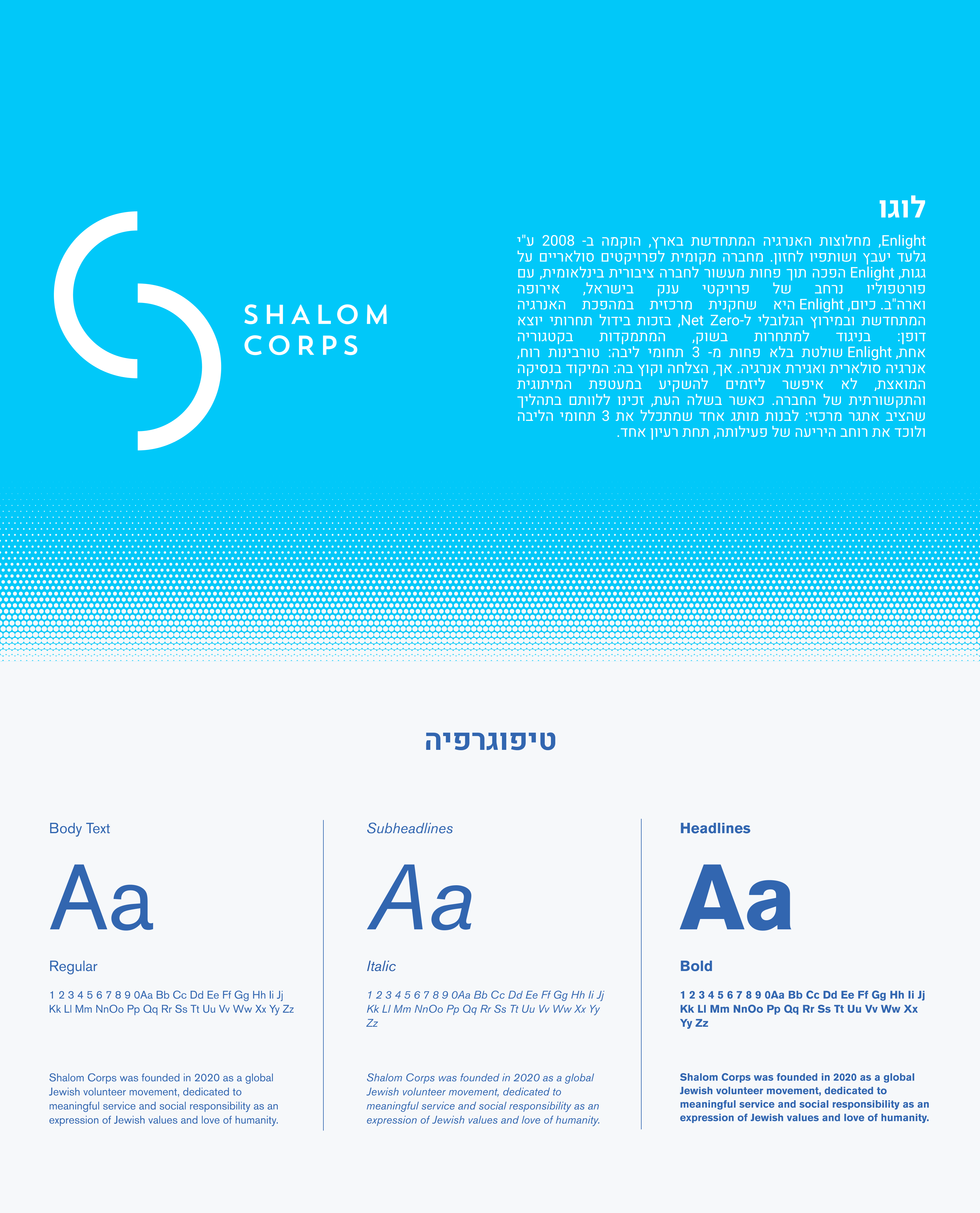 Shalom Corps היא תנועה גלובלית שמעודדת התנדבות יהודית ברחבי העולם – יוזמה שמבקשת לחבר בין עשייה מקומית, עזרה לזולת ותחושת שליחות אנושית חובקת עולם. האתגר במיתוג של גוף כזה לא היה רק ויזואלי - אלא ערכי. רצינו לזקק שפה ויזואלית שתבטא תמיכה, הכלה וחיבור בין אנשים, בלי להיות תלויה בהקשר מקומי או זהות ספציפית. היה עלינו ליצור סמל שירגיש ביתי באפריקה, טבעי בדרום אמריקה ורלוונטי גם בעבור מתנדבים באירופה וארה״ב – וכל זה מבלי לאבד תחושת חמימות, תקווה וקהיל.