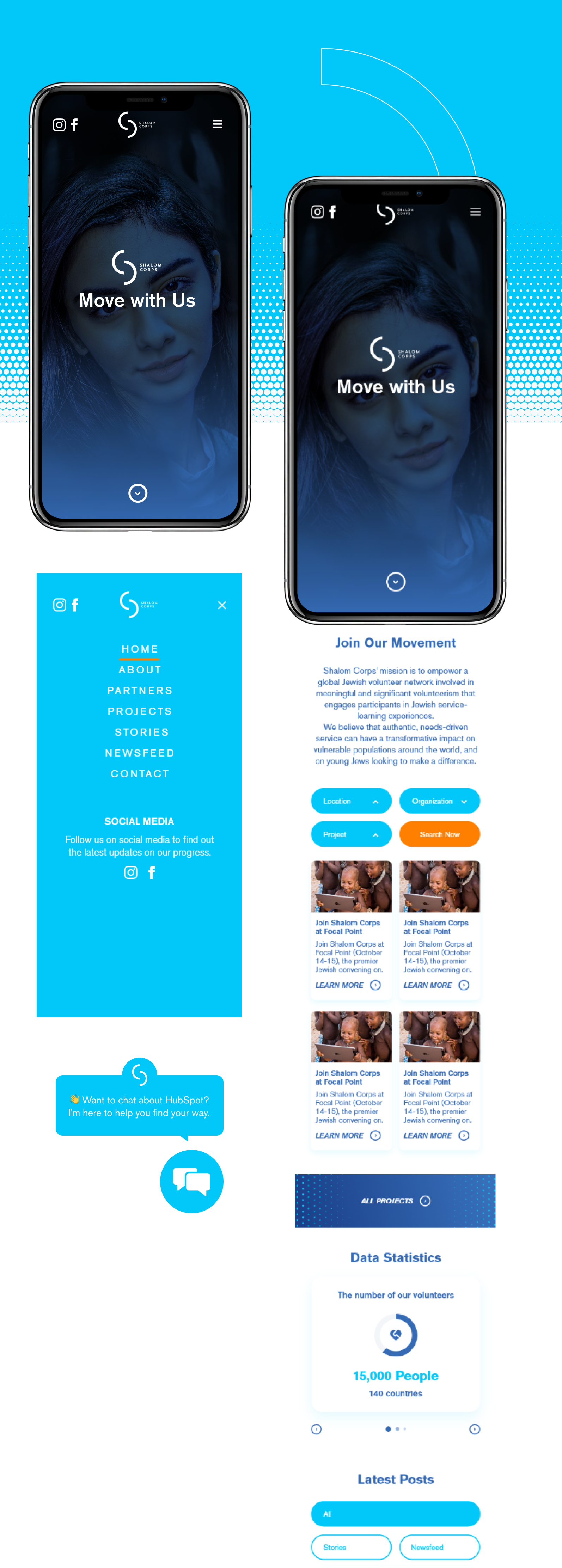 בחרנו לבטא את הערכים של Shalom Corps דרך שפה חזותית פשוטה, מדויקת ונגישה. הלוגו, שמורכב משני קווים פתוחים שיוצרים יחד מעגל כמעט שלם, מבטא חיבוק, תמיכה וחיבור – בלי להיות מפורש מדי. הוא שומר על איזון בין תנועה לשקט, בין פתיחות למבנה, בדיוק כמו ההתנדבות עצמה. הגריד הגרפי והצבעוניות הכחולה־בהירה מחדדים את התחושה הגלובלית, אך משדרים גם ניקיון, אמינות ותחושת רוגע. השפה הזו באה לידי ביטוי גם בממשקי המשתמש שעיצבנו עבורם – ממשקים שמרגישים מזמינים, חיוביים ולא מתאמצים.
